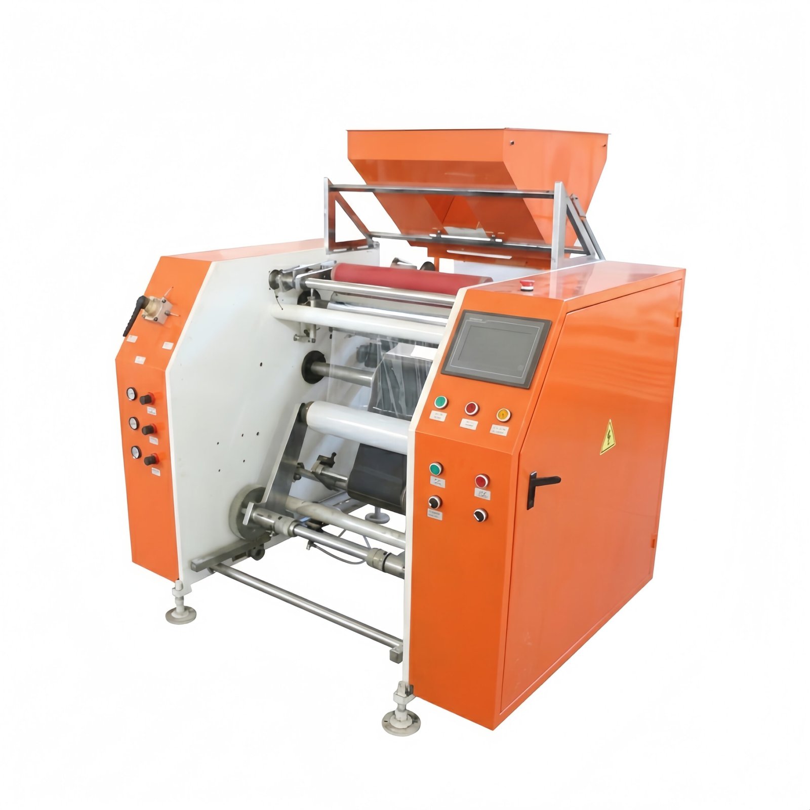 Mesin otomatis penuh yang dirancang untuk penggulungan ulang film stretch dari gulungan jumbo menjadi gulungan kecil.